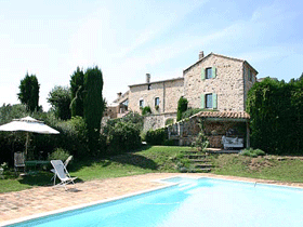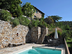 MASSIF DU TANARGUE, en Ardèche méridionale, avec une vue extraordinaire sur les monts du Parc Naturel Régional : une ancienne propriété rurale datant du 15ème siècle, rénovée de1992 à 1997 en maison à usage d'habitation de 202 m2 (séjour, salon, salle à manger-cuisine, 2 grandes chambres, salle de bains avec W.C., W.C. séparé, buanderie, lingerie), terrasses dont une de 160 m2, et 3 gîtes de 43, 53m2 et 106 m2, une piscine de 15 x 5 m), et un total de plus de 8 ha de terrain, dont 5 ha autour composé de potager, vergers, prés, forêt et source. Chauffage central au fioul et radiateurs électriques dans les gîtes.