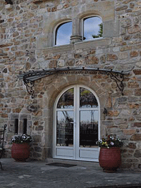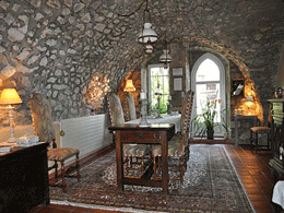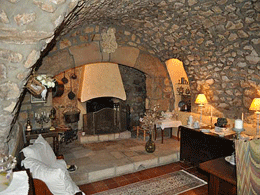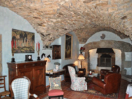 Tegenover de ingang een vestiaire van 5,40 m2 voorzien van een natuurstenen wastafel en een aparte toilet. De keuken van 26,87 m2 met marmeren werkplannen en vele kasten is eigenlijk een eetkamer voor dagelijks gebruik. Voor uw gasten is er een gewelfde eetkamer van 36,,70 m2 met een grote openhaard van 5,60 m2 en een gewelfde glazendeur opent naar de terrassen aan de voorkant. Enkele treden lager ontdekken we een grote gewelfde salon van 33,82 m2 met weer een imposante openhaard en een deur die opent naar de tuin. In het verlengde van de salon treffen we een gewelfd bureau van 24 m2 ( muurkasten inbegrepen), met een deur naar buiten.