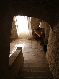 Via een intieme patio, bereikt u de ingang van het huis waar u onmiddellijk een prachtige originele stenentrap ontdekt. Gelijkvloers betreedt u de hoofdzitkamer van 47 m2 met een originele stenen vloer en een magnifieke openhaard.