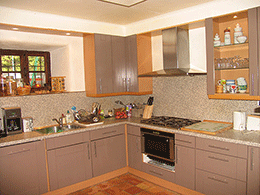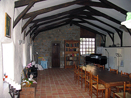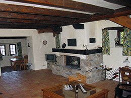 Vanuit de zitkamer lopen we naar een grote ruimte van 56m2. Een hoge antieke openhaard in natuursteen versiert deze ruimte met z’n magnifieke kastanje houten balken typisch voor de streek. Aansluitend een keuken, 8 m2, met werkplan van handgemaakte tegels. Toegang tot een dertigtal vierkante meter op de zolder, eventueel voor een uitbreiding.