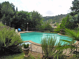 ZUID ARDÈCHE, 20 km van Aubenas en 30 km van de Autoweg A7, MET EEN PANORAMISCHE UITZICHT over de Zuid Ardèche tot aan de Cevennen, ligt een oude boerderij die gerenoveerd is tot een charmant verblijf zonder buren dichtbij, met 5411 m2 aangrenzend mooi beplant terrein, zwembad, overdekte terrassen, garage, 2 bijgebouwen. Een grote zitkamer met openhaard, een keuken, 3 slaapkamers, grote vide en bureau. Elektrische verwarming en houtkachel. Septic tank. ADSL internet.