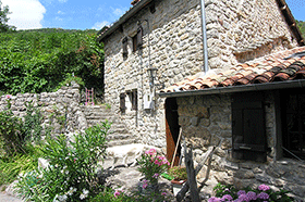 In de omgeving van THUEYTS, even buiten een gehuchtje, twee bij elkaar liggende verbouwde huizen van 1650 met 9,6 ha terrein tot aan de rand van de rivier, een overheersend uitzicht, houten opzetzwembad. Houtkachels en elektrische radiatoren Bronwater en stadswater. 2 septic tanken. Smal weggetje op een paar honderd meter er naar toe.